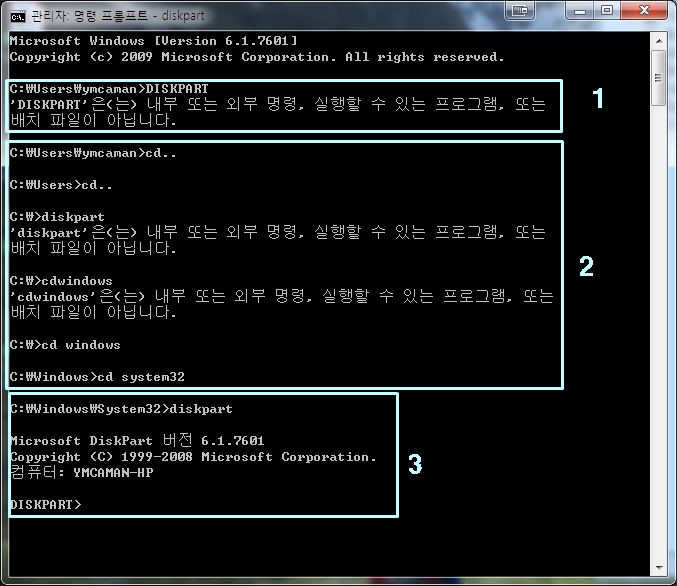 명령 프롬프트 창에 'DISKPART'를 입력하고 엔터를 쳤더니 '내부 또는 외부명령, 실행할 수 있는 프로그램, 또는 배치 파일이 아닙니다"라고 에러메시지가 나왔습니다.