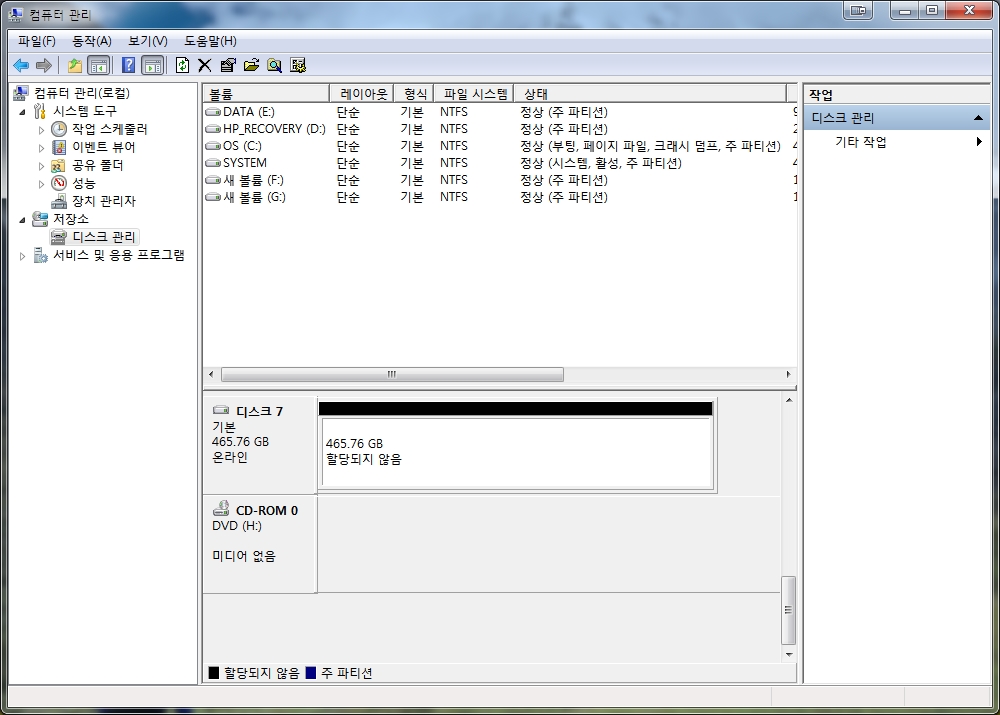 본격적인 파티션 삭제에 앞서서 파티션을 삭제 할 디스크를 확인해야 합니다. 디스크 관리 메뉴를 열어보면 파티션 삭제를 해야하는 디스크를 확인할 수 있습니다. 여기서는 디스크7에 나뉘어져 있는 파티션을 삭제해야 합니다.