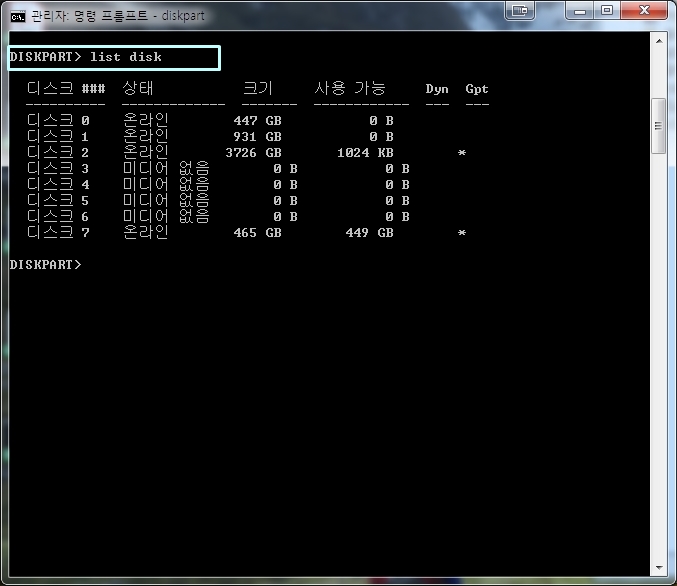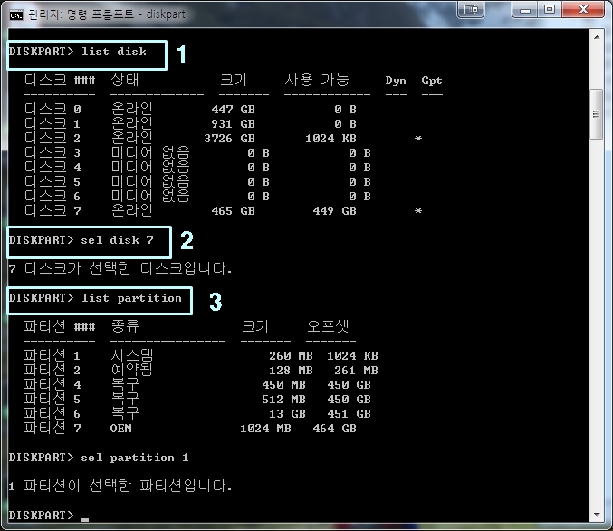 디스크를 선택하기 위한 명령어는 'Sel'입니다. 명령프롬프트에 'sel disk 7' 이라고 입력하면, 디스크 7번이 선택됩니다.