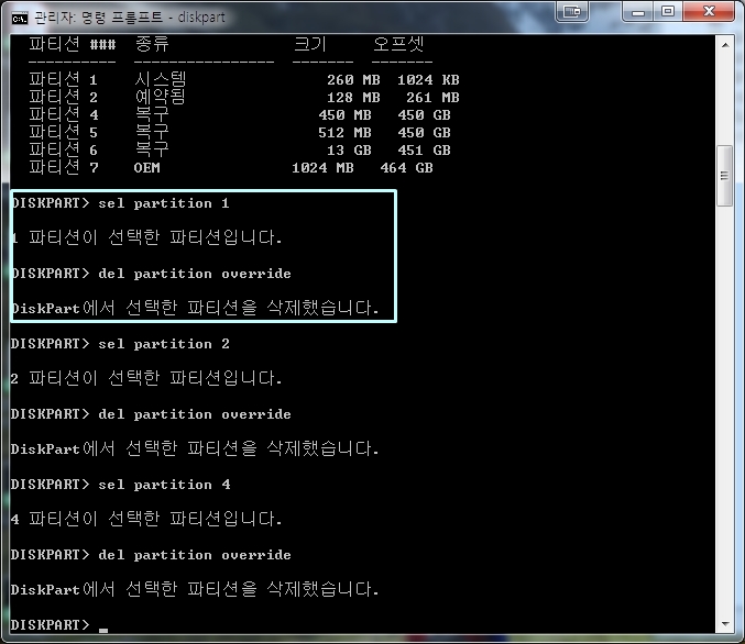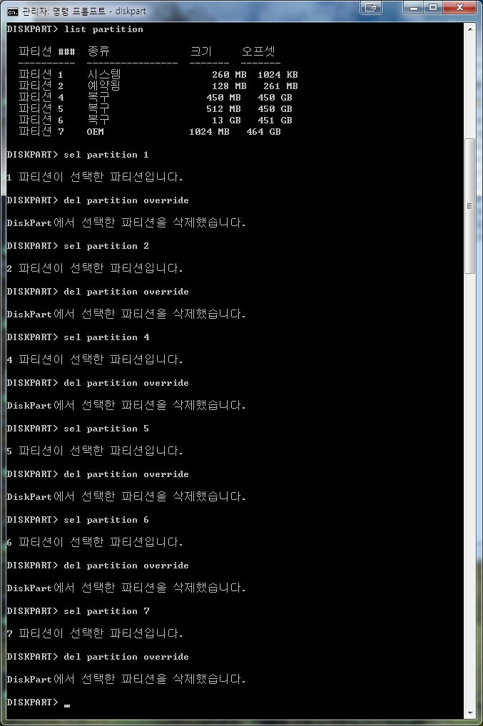 파티션 삭제는 del partition override 선택한 파티션 삭제 입니다.