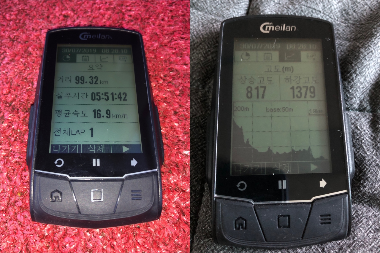 메이란 속도계 컴퓨터에 찍힌 기록을 봐도 마찬가지입니다. 무주에서 논산까지 96.4km를 달리는 동안 상승고도는 817미터, 대신 하강고도는 1379미터입니다. 말하자면, 하강고도만 놓고 본다면 지리산 노고단 대피소 높이부터 자전거를 타고 하산 한 것과 비슷합니다.