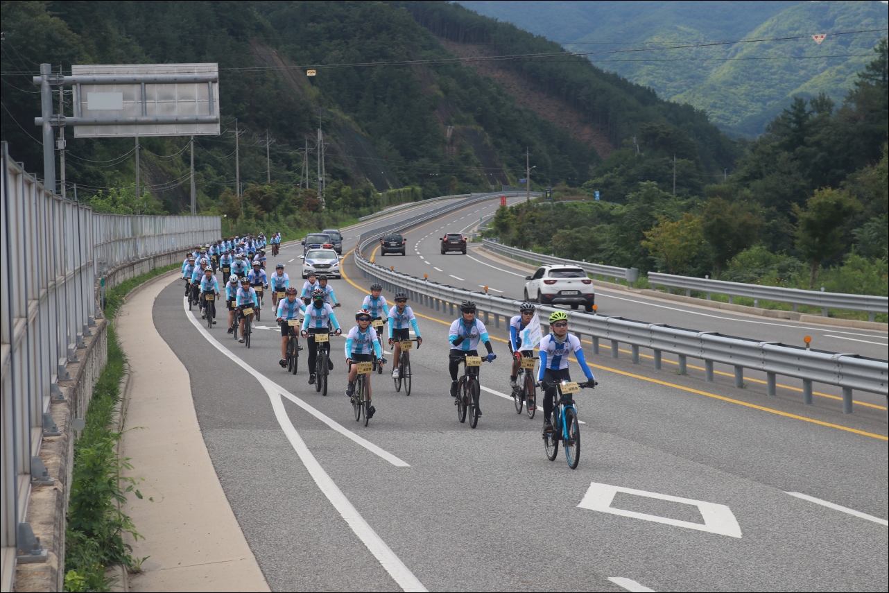 청소년 통일자전거 국토순례 라이딩 3일차는 무주토비스 콘도를 출발하여 논산 리더스 펜션까지 99.3km를 달렸습니다. 다행히 무주에서 논산으로 이동하는 구간은 전날 업힐을 보상 받는 상쾌한 출발이었습니다. 해발 686미터에 있는 토비스콘도를 출발하여 해발 250미터 지점인 첫 번째 휴식지 적상체육공원까지는 꾸준히 고도를 낮추면서 내려오는 내리막길이기 때문입니다.