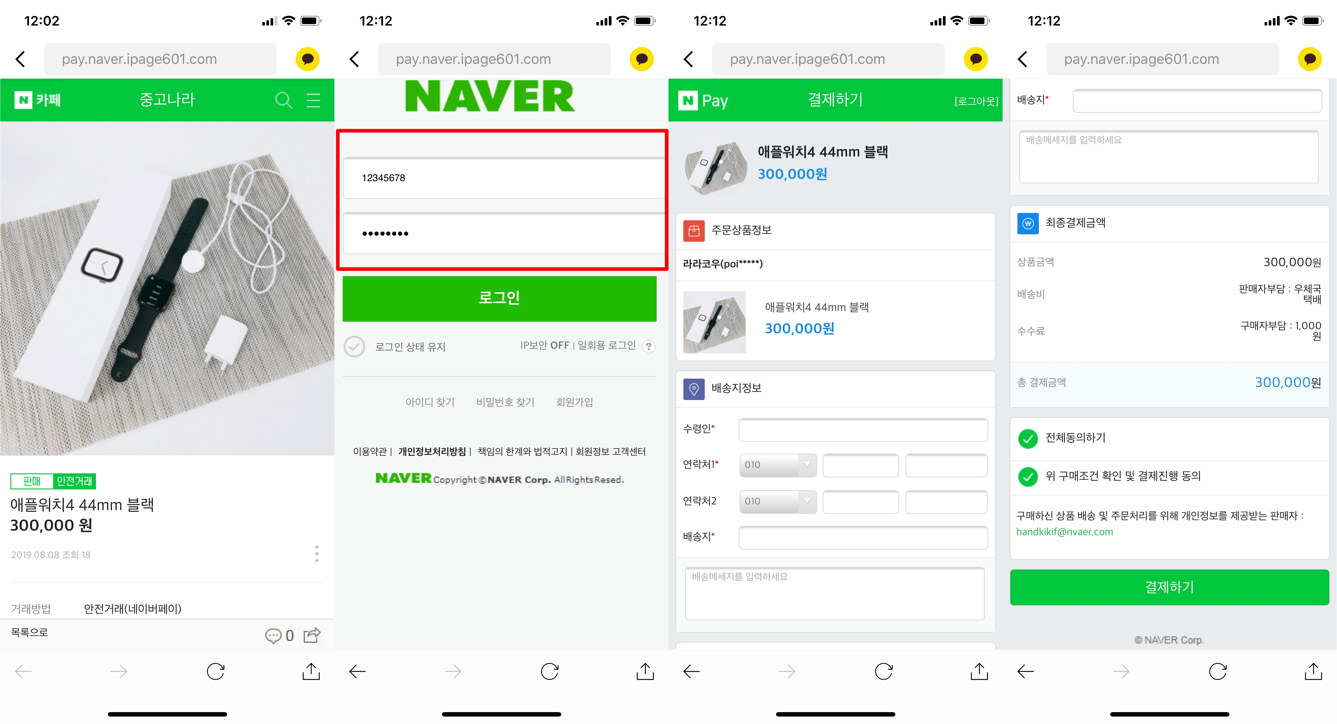 하지만, 안전거래라고 하더라도 모두 안심할 수 있는 것은 아닙니다. 애플워치4를 구입하기 위해 약 3주 동안 매일 중고나라 사이트를 살펴보고 사기꾼들의 전형적인 수법을 모니터링 해봤더니, '네이버페이 안전결제' 사이트를 가짜로 만들어서 무통장 입금을 유도하더군요.