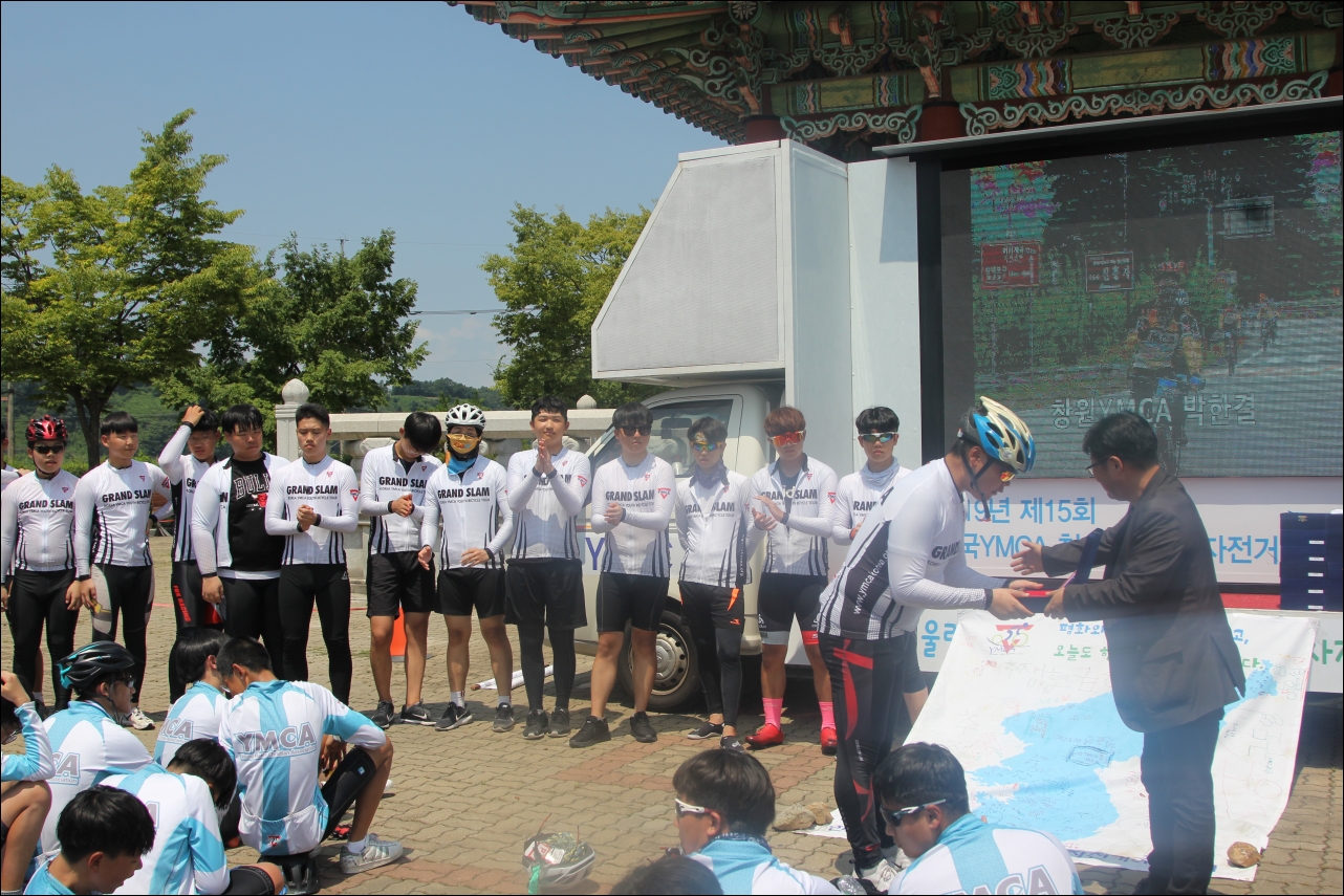 그랜드슬램 참가자들은 국토순례 마지막 날에 '그랜드슬램'이 선명하게 새겨진 하얀색 기념 저지를 입고 '보무도 당당하게' 라이딩을 하게 됩니다. 응원하는 사람들도 감동이지만, 역시 당사자가 느끼는 감동이 제일 클 것입니다. 15회를 맞이하는 올해는 참가자로 그랜드슬램을 마치고 자원지도자로 참가한 친구들이 유난히 많았습니다. 로드가이드로 참가자들과 같이 자전거를 탄 친구들도 있고, 진행팀, 홍보팀, 프로그램팀, 총무팀에서 지원하는 역할을 맡았던 자원지도자들도 여럿 있었답니다.