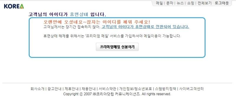 최근 코리아닷컴으로 메일을 보냈다는 지인이 있어서 확인하려고 로그인을 했더니 접속이 안되면서 아래와 같은 메시지가 나타났습니다. "고객님의 아이디가 휴면상태로 전환"된 것은 알겠는데, "휴면상태 해제를 위해서는 '프리미엄 메일'서비스를 가입하셔야 메일 이용이 가능"하다는 메시지는 도무지 납득이 되지 않았습니다. 프리미엄 메일은 매월 3300원 유료 결제를 해야 하는데 코리아닷컴 메일 서비스는 유료로 사용해야 할 만큼 매력적인 요소가 하나도 없습니다.