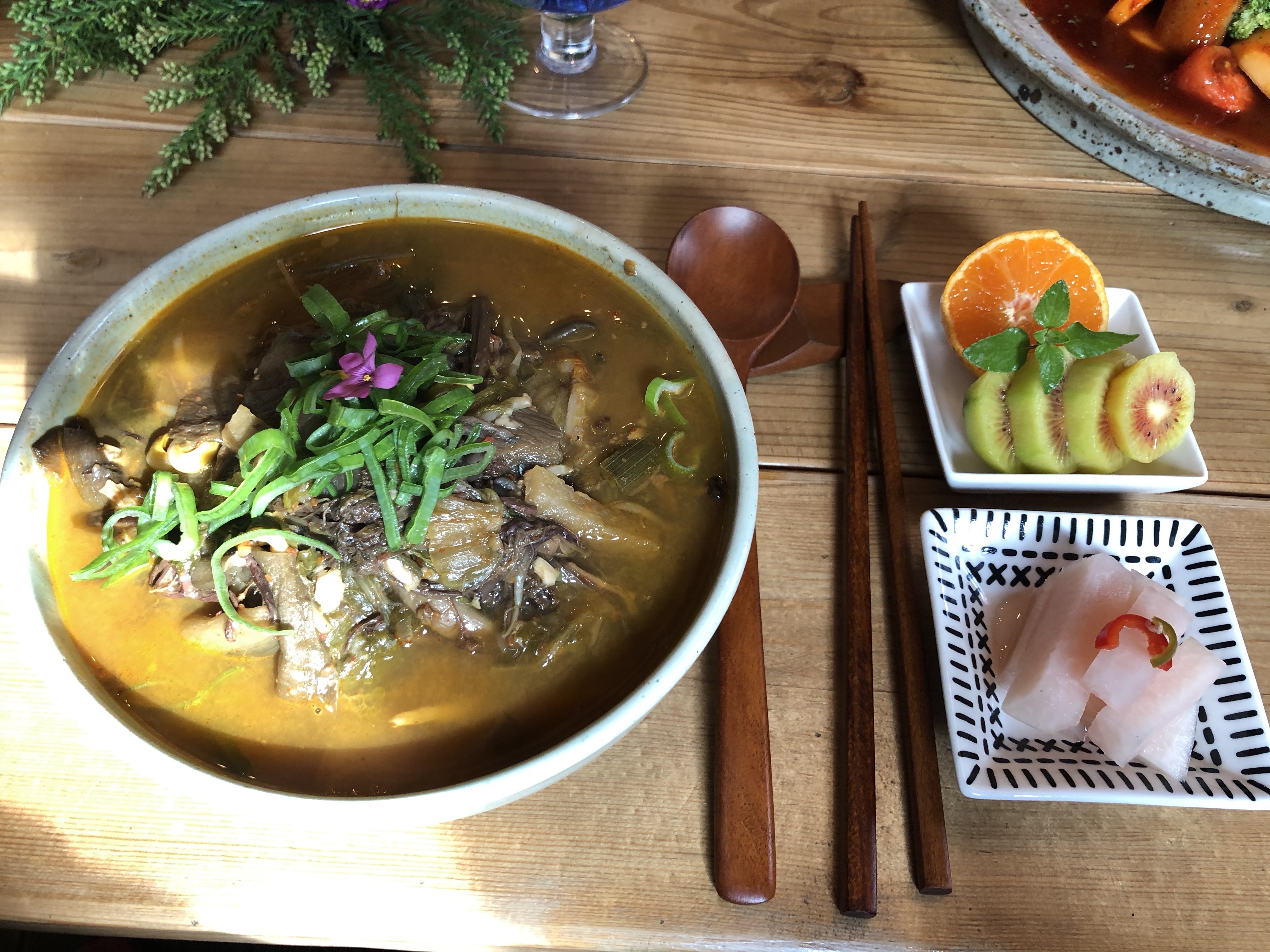 채계장은 아주 약간의 콩고기가 들어가기는 하지만, 기본적으로는 여러 가지 채소를 깊게 깊게 우려 낸 물에 육계장에 들어가는 재료들로 만든다고 합니다. 맛도 맛이지만 꽃 잎 한 송이가 놓여 있는 채계장 그릇은 숟가락을 들기가 미안할 정도로 예뻤습니다.