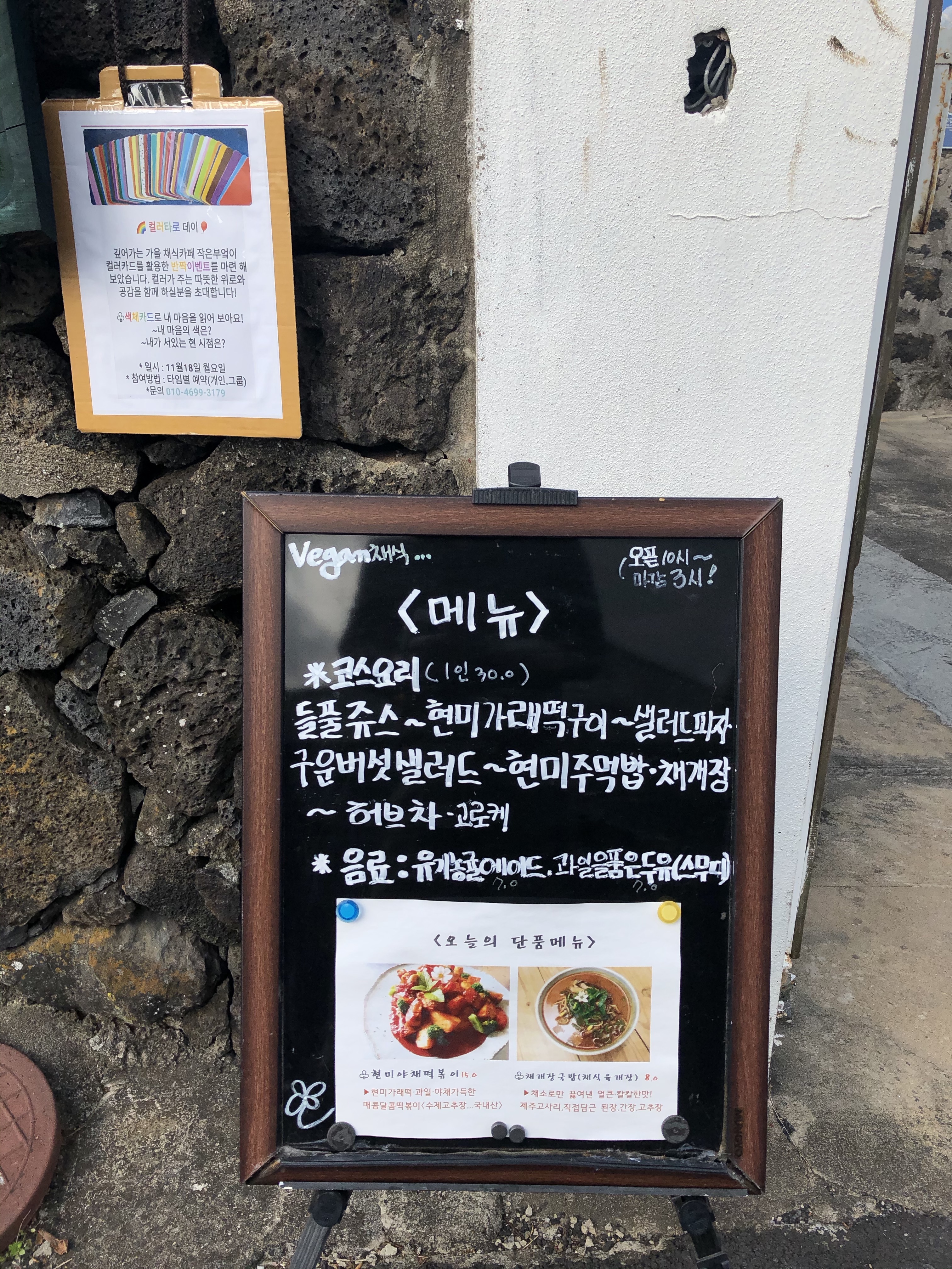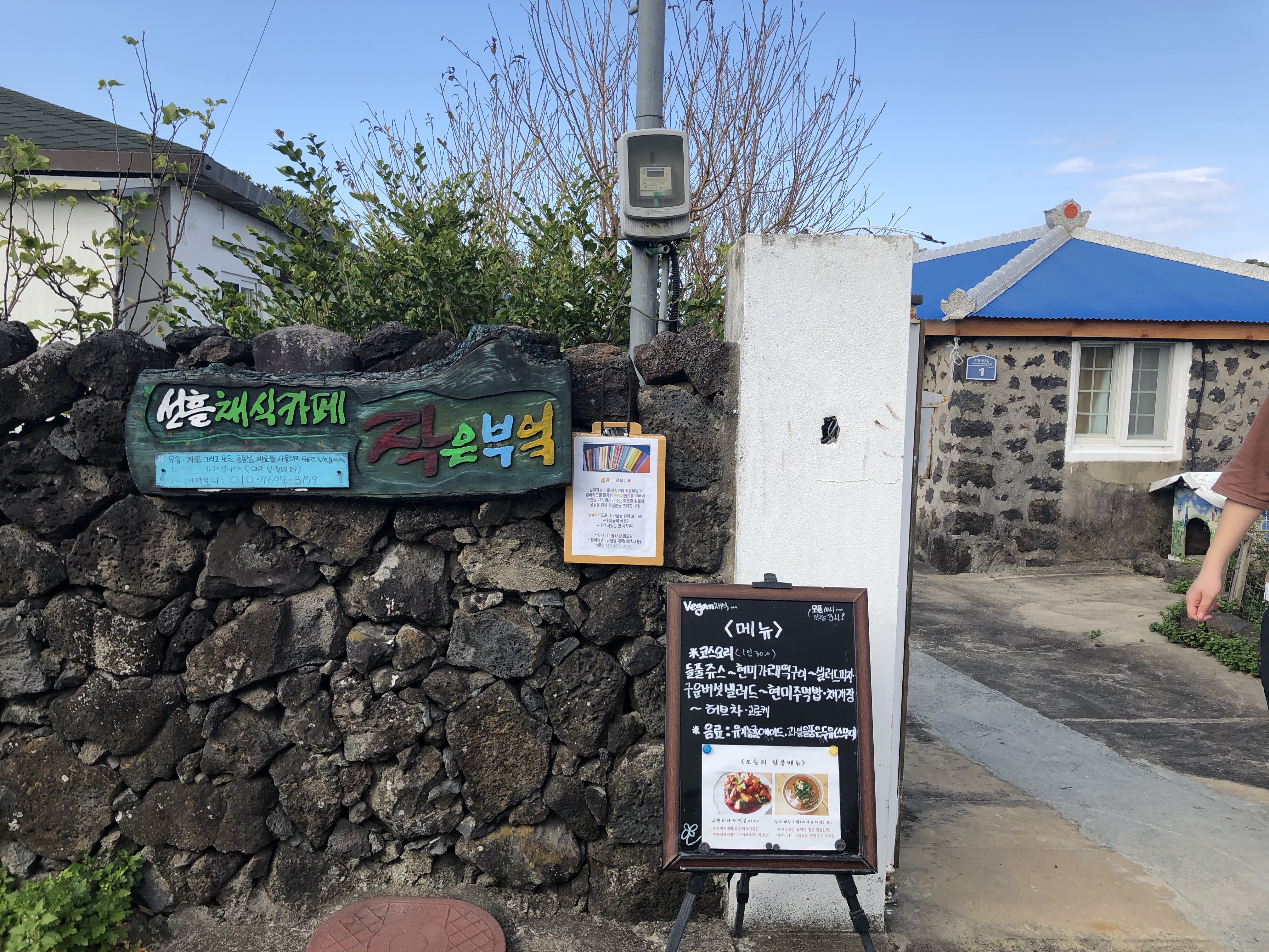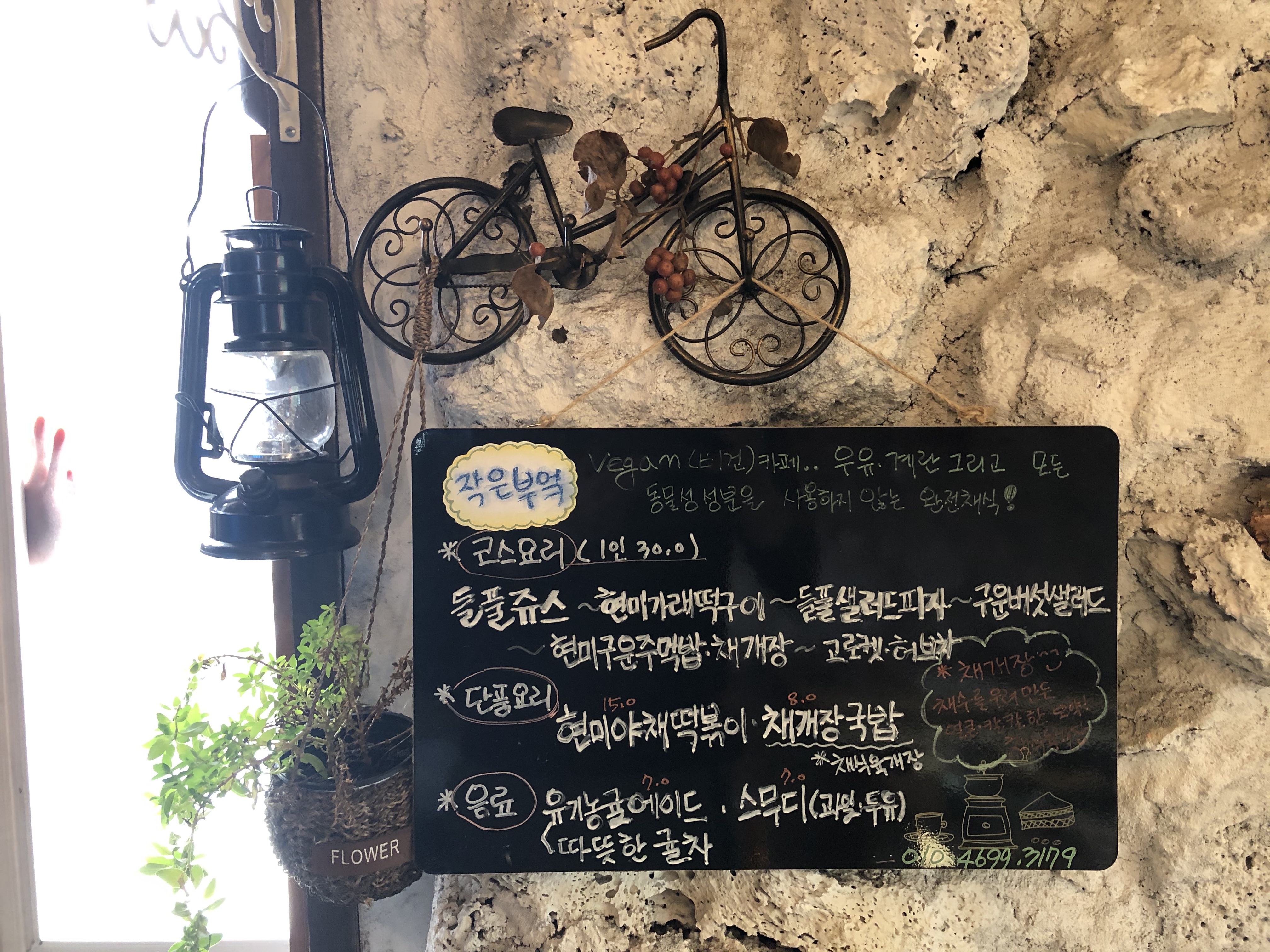 제주 농가 돌집으로 된 작은 부엌에는 식탁 두 개가 전부였습니다. 메뉴판을 보면 우유, 계란 그리고 모든 동물성 성분을 사용하지 않는 완전 채식 요리를 한다고 되어 있습니다. 코스 요리를 예약 하실 분들은 메뉴판 아래 휴대전화로 예약하시면 됩니다.