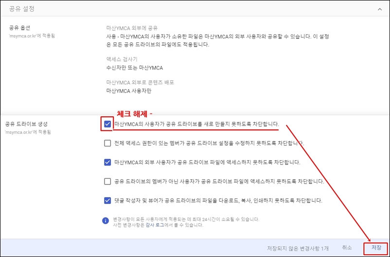 □마산YMCA의 사용자가 공유 드라이브를 새로 만들지 못하도록 차단합니다 |