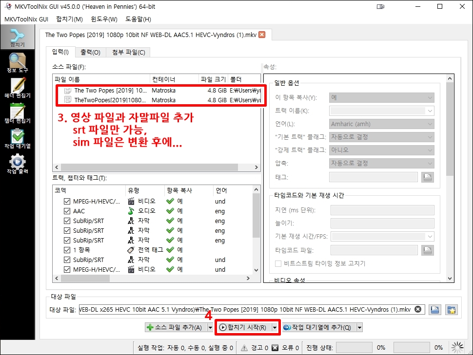 마지막으로 <합치기 시작>을 누르면 자막이 빠르게 합쳐집니다. 제 느낌으로는 <카카오 인코더>보다 MKVToolNix GUI 가 더 빠릅니다.