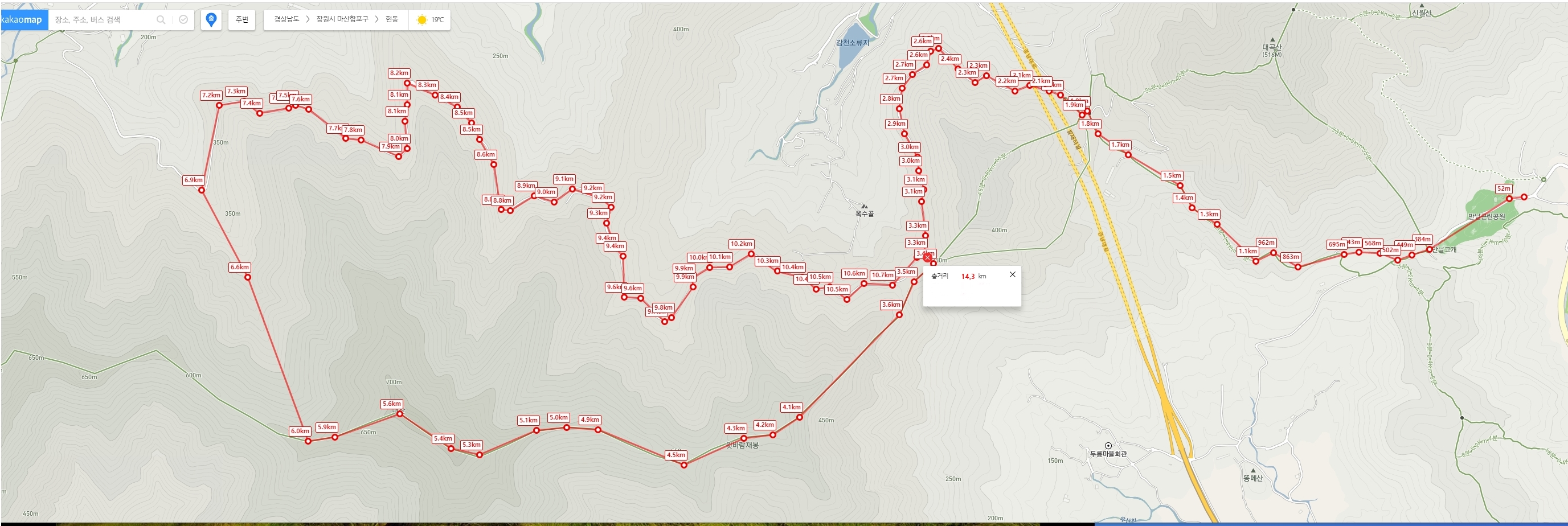 임도를 따라 7~8km를 더 걸어서 만날재 주차장까지 내려왔습니다. 스마트폰 어플에 기록이 제대로 되지 않아 인터넷 지도를 놓고 거리를 측증해보니 대략 15km 정도는 걸었겠더군요. 산길 반, 임도 반이었지만 제법 많이 힘들었습니다. 특히 쌀재에서 만날재까지 내려가는 마지막 2km 시멘트 길이 가장 힘들었습니다.