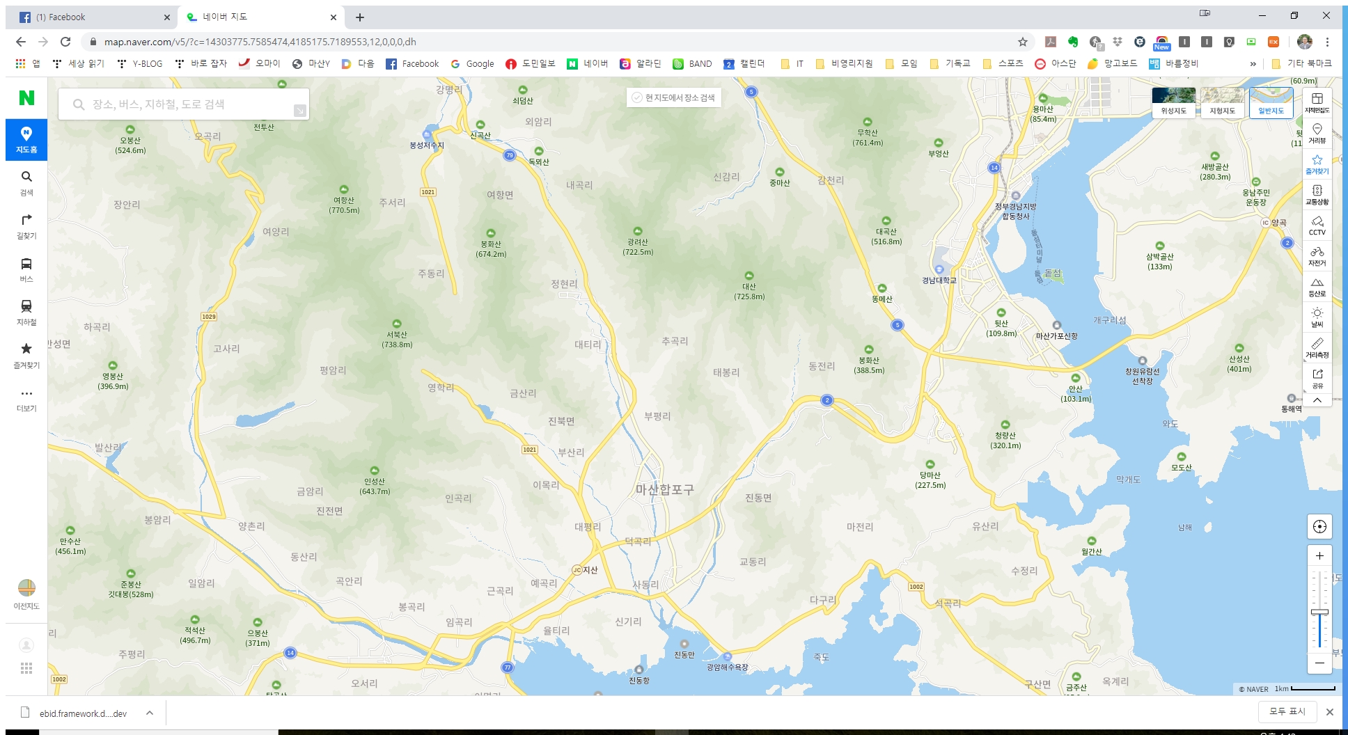 해발 725미터 대산은 무학산(761미터)보다 조금 낮은 산입니다. 하지만 정상에 올라서면 멀리 진동만까지 멋진 탁 트인 바다 풍광을 볼 수 있습니다. 특히 정상을 지나 광려산쪽으로 가는 나무 데크에서 바라보는 경치는 정말 아찔한 느낌이 들더군요. 설악산 같은 높은 산에 오른 것 같은 착시현상이 생길 정도였습니다. 아래 지도에서 보시는 것처럼 멀리까지 남쪽 바다가 파랗게 펼쳐졌습니다.