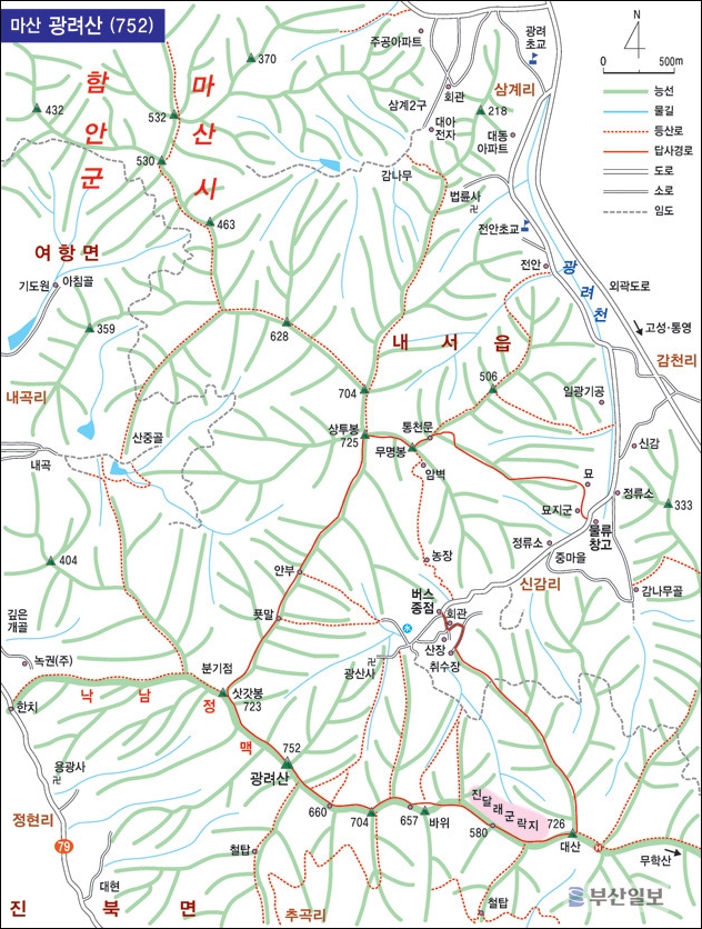 해발 725미터 대산은 무학산(761미터)보다 조금 낮은 산입니다. 하지만 정상에 올라서면 멀리 진동만까지 멋진 탁 트인 바다 풍광을 볼 수 있습니다. 특히 정상을 지나 광려산쪽으로 가는 나무 데크에서 바라보는 경치는 정말 아찔한 느낌이 들더군요. 설악산 같은 높은 산에 오른 것 같은 착시현상이 생길 정도였습니다. 아래 지도에서 보시는 것처럼 멀리까지 남쪽 바다가 파랗게 펼쳐졌습니다.