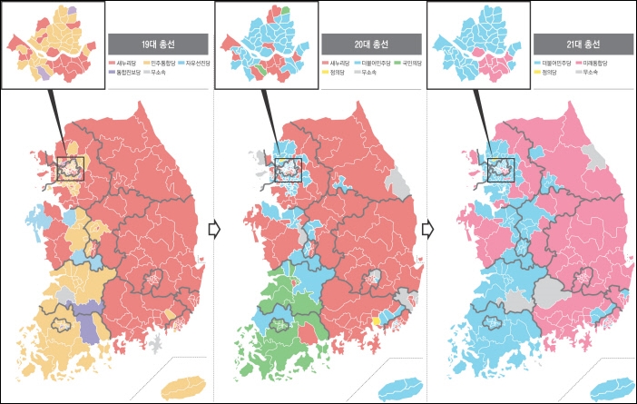 가운데 사진이 지난 번 총선 결과인데, 의석 수로 보면 파란당이 국회 1당이 되었는데 지도에는 붉은색이 훨씬 많습니다.