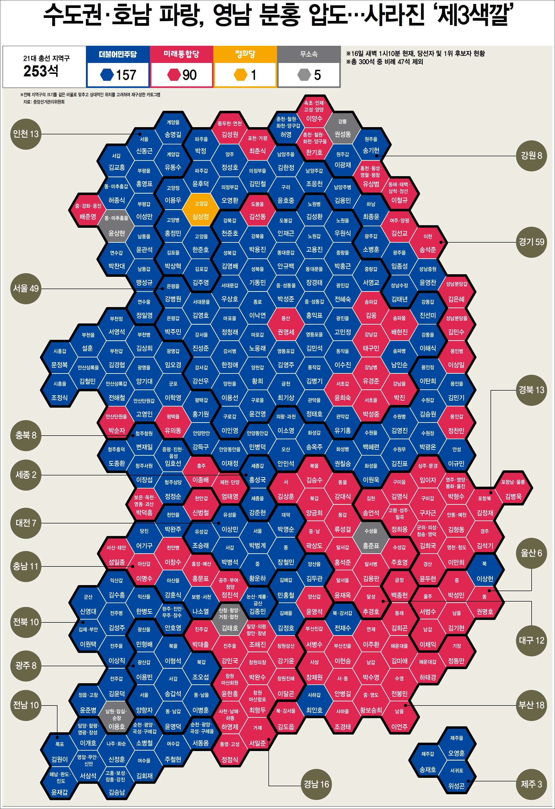 하지만, 다음날 아침 제가 구독하는 종이 신문에 나온 지도는 면적을 무시하고 국회의원 선거구 별로 당선자 지도를 만들었더군요.