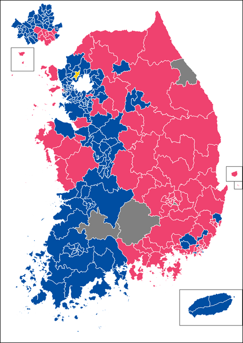 아무튼 방송사 출구 조사 결과를 토대로 만든 예상 의석수를 보여주는 지도를 보면서 참 부자연스러웠습니다. 파란색 상징색을 사용하는 정당의 과반 이상 당선이 예상되는 상황인데도 지도만 놓고 보면 분홍색 상징 색이 가득하였기 때문입니다.