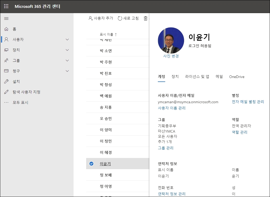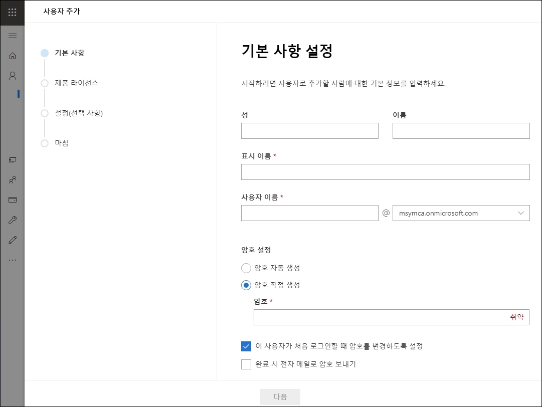 저의 경우를 예로 들어보면 제가 자주 사용하는 <ymcaman>이라고 아이디를 등록하면 저희 단체 도메인(msymca)과 연결되는 ymcaman@msymca.onmicrosoft.com 으로 계정이 만들어집니다.