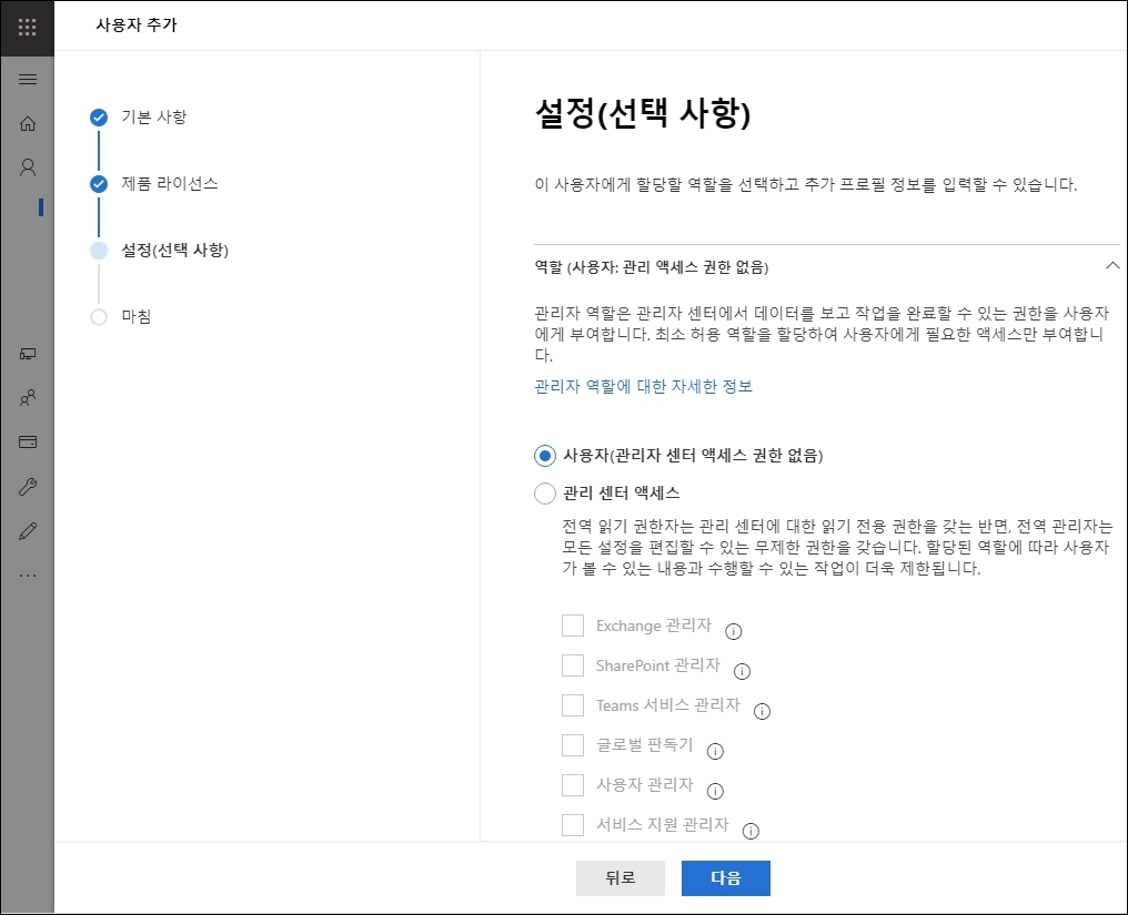 사용자 등록 마지막 화면은 역할을 구분하는 것입니다. 일반적으로는 <사용자>로 권한을 등록하면 됩니다. 만약 사용자 중에서 관리자 역할이 필요한 사람이 있으면 <관리센터 엑세스>를 체크 하시고, 아래에 있는 각각의 관리자 권한을 역할에 맞게 부여하면 됩니다.