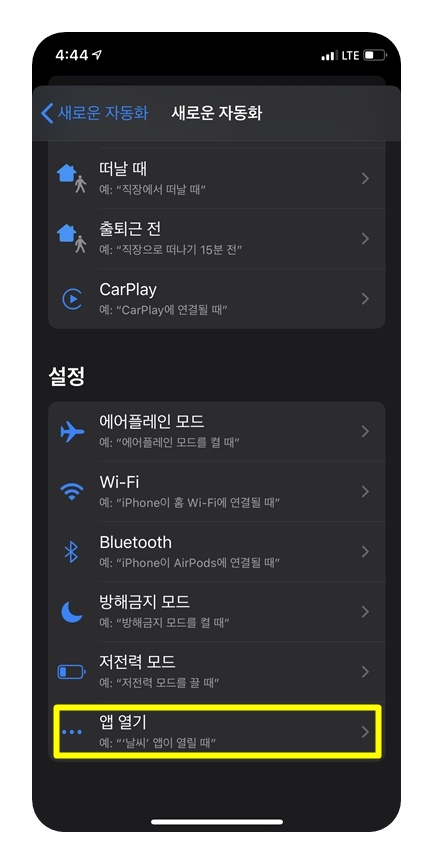아무튼 단축어 앱을 실행 한 후 맨 아래쪽 '자동화'를 선택하고 '다음'을 눌러줍니다.