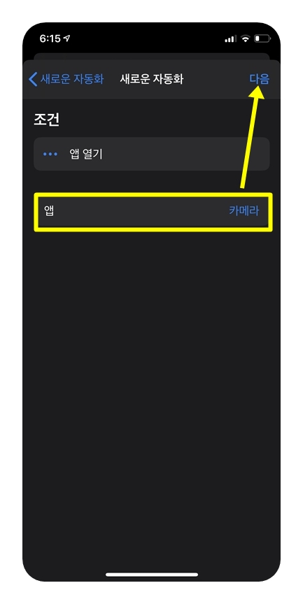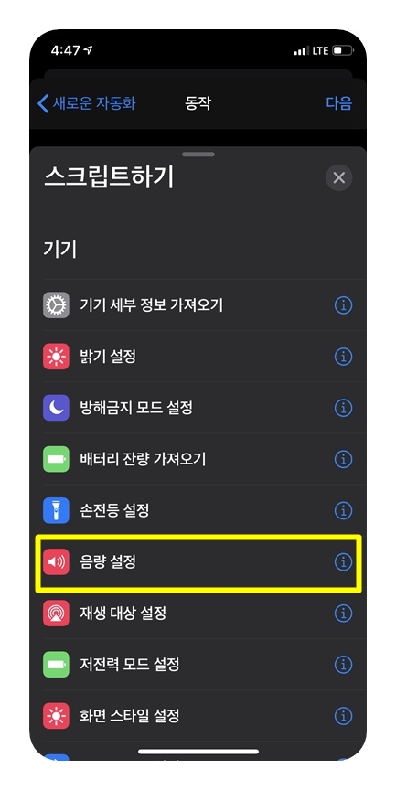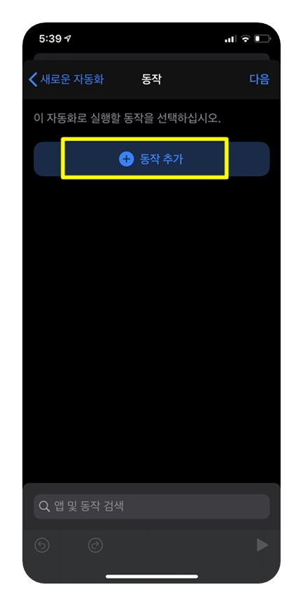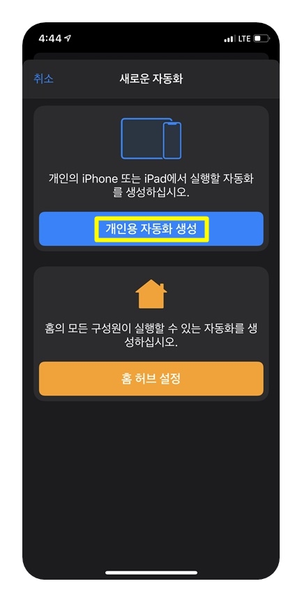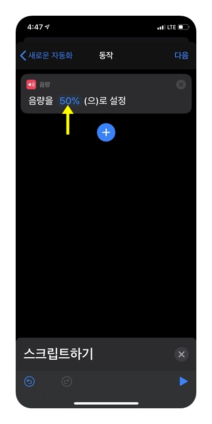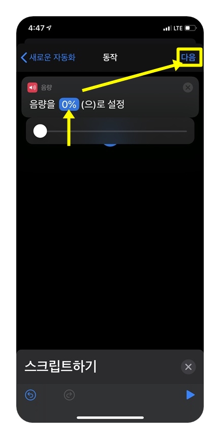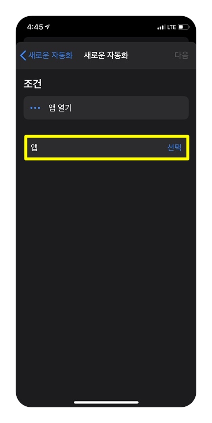 아무튼 단축어 앱을 실행 한 후 맨 아래쪽 '자동화'를 선택하고 '다음'을 눌러줍니다.