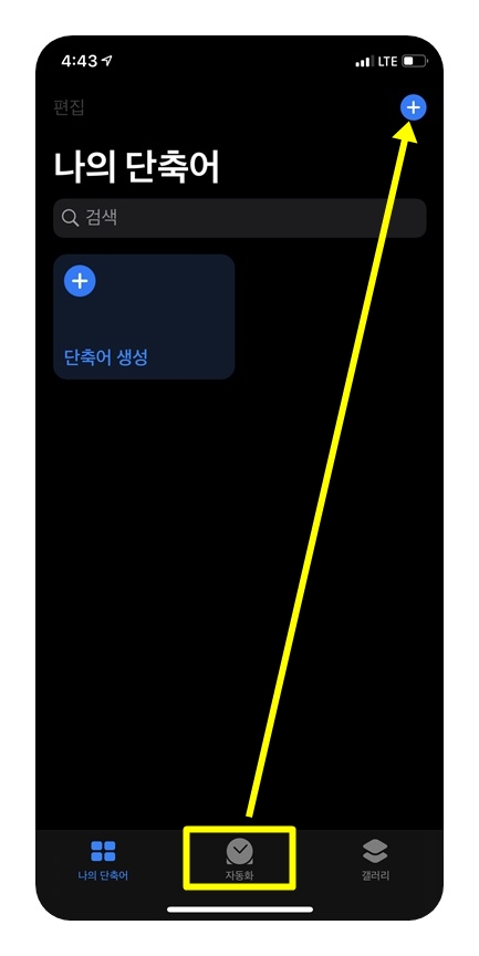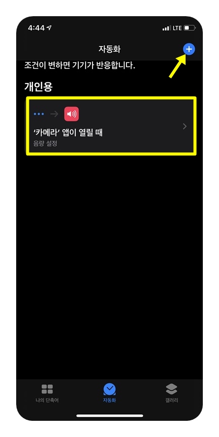 저는 이미 '카메라 앱이 열릴 때' 음량을 0으로 하도록 개인용 단축어가 생성되어 있습니다. 오른쪽 위 '+'를 누르면 새로운 자동화를 만들 수 있습니다.