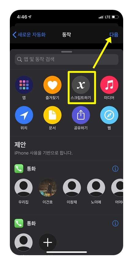 동작의 종류가 여러가지 있는데 그 중에서는 '스크립트 하기'를 선택하고 다음을 눌러줍니다.