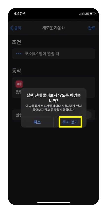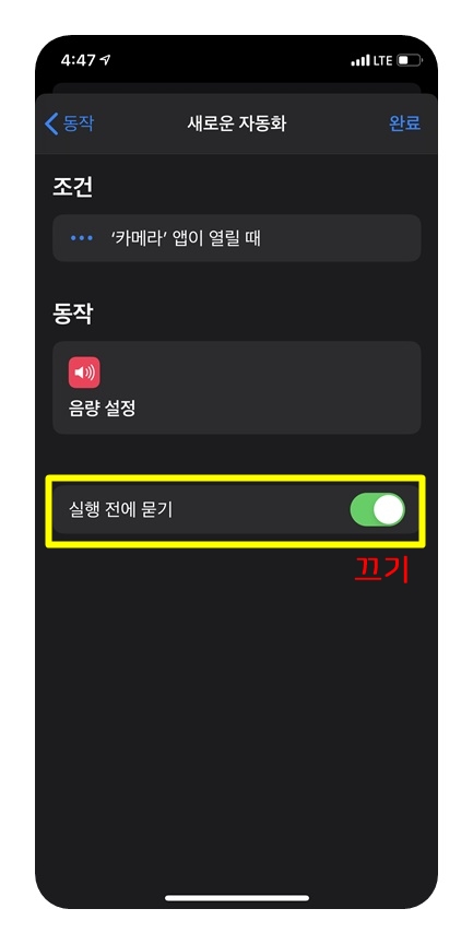 자 이제 설정이 끝났습니다. 카메라 앱이 열릴 때 음량 설정이 '0%'로 자동으로 바뀌게 되는 겁니다.