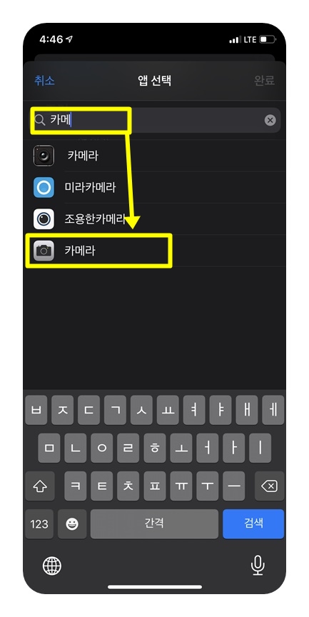 내 아이폰에 있는 모든 앱이 나타납니다. 검색에서 '카메라'를 검색하여 아이폰 '기본 카메라 앱'을 선택하고 '완료'를 누릅니다. (저는 기본 카메라 무음 설정을 하고나서 다른 카메라 앱들은 삭제하였습니다.)