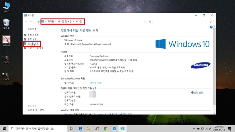 만약 바탕화면에 내컴퓨터가 없는 분들은 <탐색기> 같은 곳에서 <내컴퓨터>를 찾아 오른쪽 마우스를 클릭한 후<속성>을 열어도 됩니다. 혹은 윈도우10 시작 아이콘 옆에 검색어 '제언판'을 입력한 후 시스템 및 보안> 시스템 순서로 찾아들어가면 아래 화면이 열립니다.