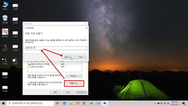 맨 처음 복원지점은 만들 때는 아래 쪽 <만들기>를 클릭하면 새로운 창이 열립니다. 새 창에서는 복원 지점 이름을 정해주어야 하는데, 저는 날짜로 이름을 만들어주었습니다.