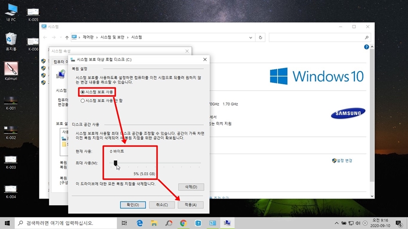 먼저 <시스템 보호 사용>으로 체크를 변경해 주시고 시스템 보호에 사용할 공간의 용량을 설정하면 됩니다. 저는 보통 C드라이버 전체 용량의 10% 정도를 저장공간으로 선택해 줍니다. 위 사진에서 처럼 마우스로 끌어주면 용량을 증가 시킬 수 있습니다.