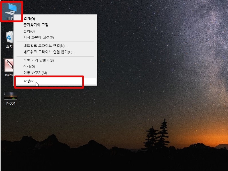 먼저 바탕화면에 <내컴퓨터> 아이콘이 있는 분들은 오른쪽 마우스를 클릭하셔서 <속성>을 누르시면 다음 화면으로 넘어갑니다.