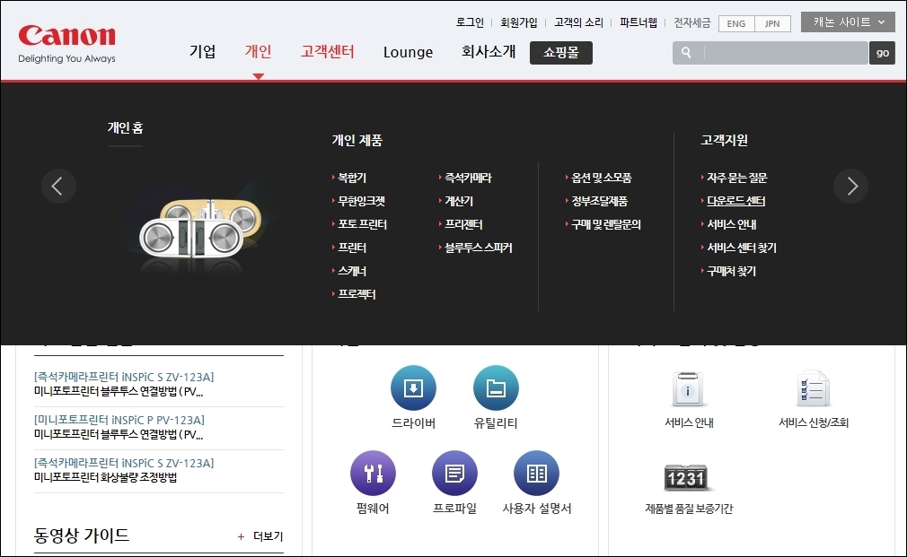 인터넷에서 캐논 사무기기로 검색하면 아래 사진과 같은 사이트로 연결됩니다. 개인 고객 - 다운로드 센터를 차례대로 선택하면 됩니다.
