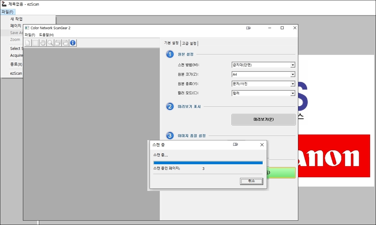 이제 다시 컴퓨터 ezScan 프로그램으로 돌아가서 '스캔'을 누르시면 아래 사진과 같이 차례 차례 스캔이 이루어집니다.