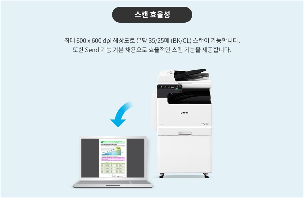 복합기에 있는 스캐너를 활용하면 분당 25매 이상 스캔을 받을 수 있기 때문에 평판 스캐너와는 비교할 수 없는 빠른 속도로 문서를 스캔 받을 수 있습니다.