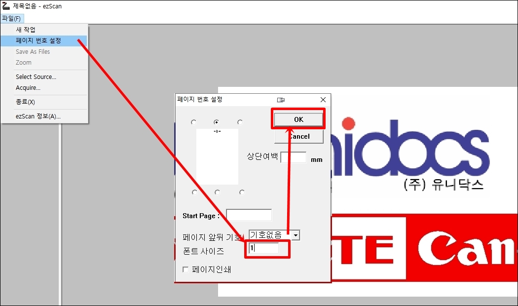 맨 먼저 페이지 번호 설정을 해줍니다. 이유는 모르겠고 아무튼 폰트 사이즈를 1로 설정하고 OK를 누르시면 설정이 끝납니다.