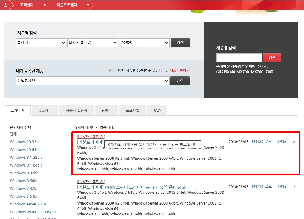 이젠 기종을 찾아서 드라이브를 다운 받을 차례입니다. 1차 분류 복합기 - 2차 분류 디지털 복합기 - 3차 분류에서 iR-2525를 선택합니다.