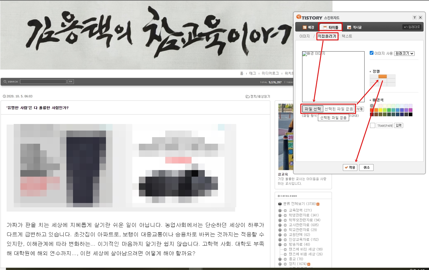 위 사진은 티스토리 기본 타이틀 텍스트 제목과 그림 파일(김용택의 참교육이야기)가 겹쳐서 나온 것입니다.