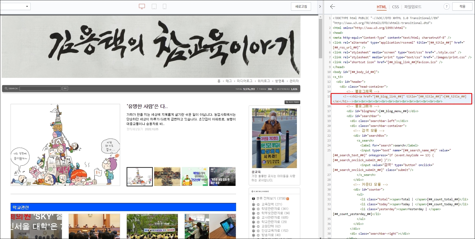티스토리 관리화면으로 들어가 HTML/CSS 편집을 클릭합니다. 그리고 HTML 편집을 선택하여 코드를 일부 수정해주시면 됩니다. 아래 사진 왼쪽 창은 수정된 결과를 보여주는 화면이고, 오른쪽은 HTML를 수정하는 창입니다.