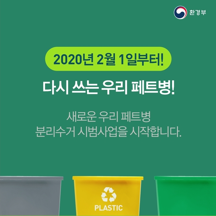 페트병 고품질 재활용 비율을 높이기 위해 정부는 2020년 2월부터 서울 등 일부 지방자치단체에서 페트병 분리수거 시범사업을 시작하였으며, 7월부터는 아파트를 비롯한 공동주택을 대상으로 페트병 분리수거 시범사업을 진행하고 있습니다. 시범 사업은 페트병을 투명 페트병과 유색 페트병으로 분리하고 비닐 라벨을 반드시 제거하여 수거하도록 하는 것입니다.
