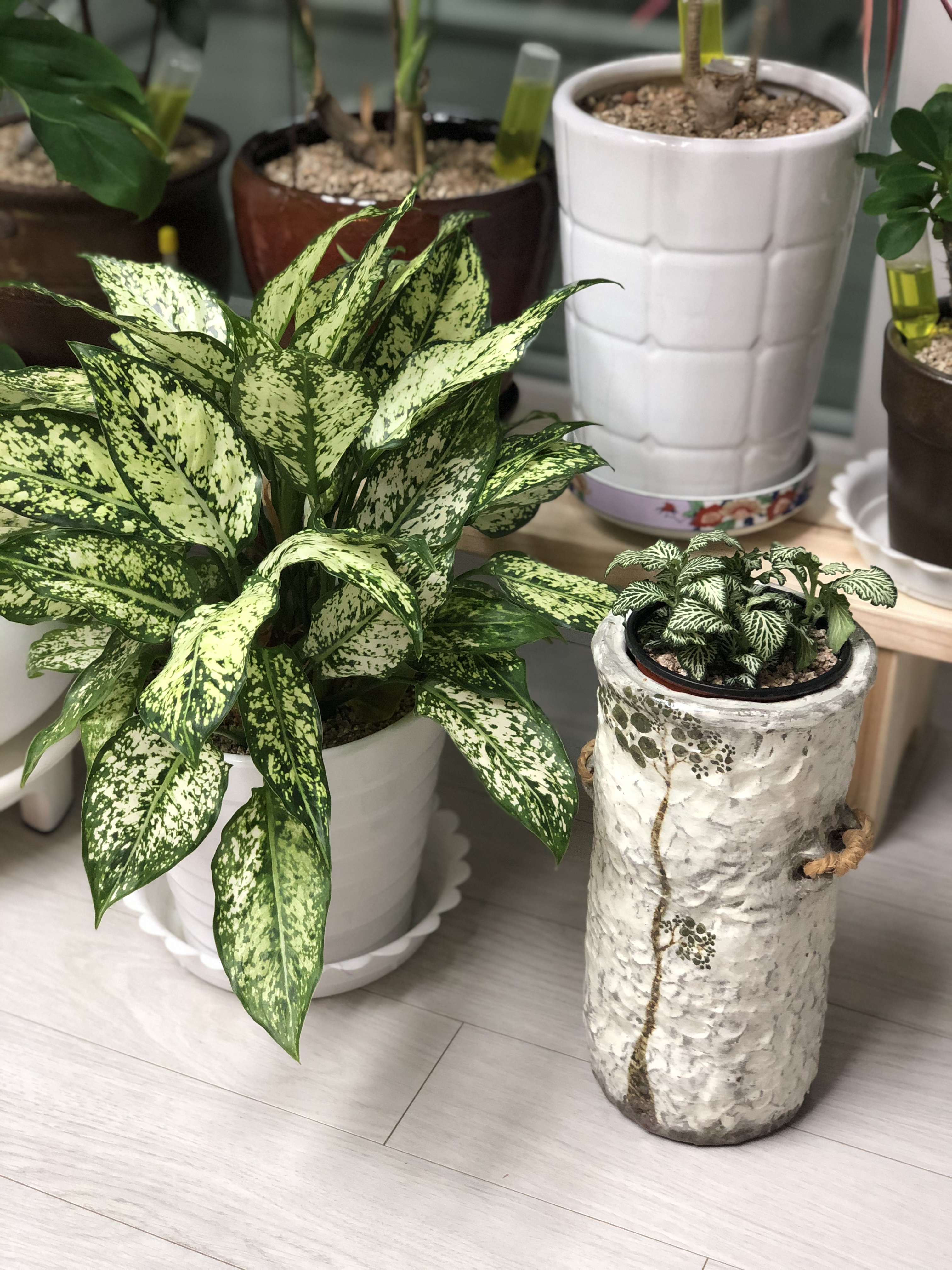 당분간은 도자기 화분에 담아 키우다가 식물들은 화분의 크기 만큼 자란다고도 하고, 너무 좁고 답답해 보여 조만간 큰 화분으로 옮겨 심을 예정입니다. <피토니아 화이트스타>는 저희 집에 있던 다른 반려 식물들과도 잘 어울립니다.