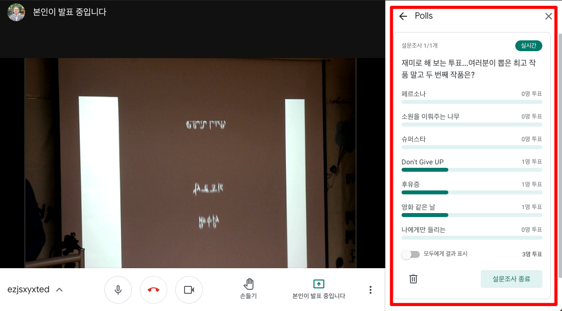 <출시>를 클릭하면 설문지가 회의 참가자들에게 배포 됩니다. 설문지를 미리 만들어서 저장해 두었다가 회의 진행에 맞추어서 <출시>하면 됩니다. 결과는 회의 진행자만 볼 수도 있고, 회의 참가자 모두에게 공개할 수도 있습니다.