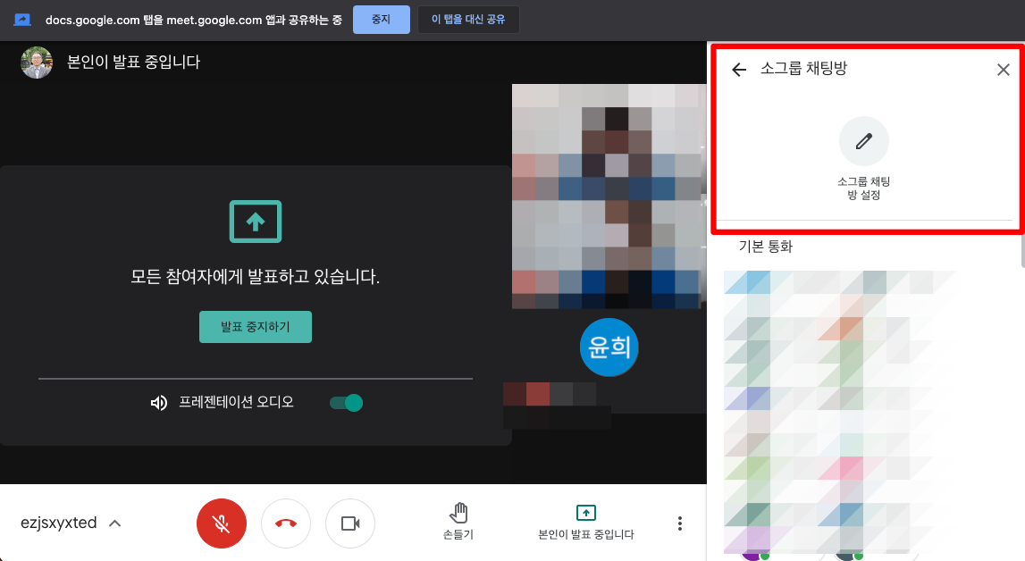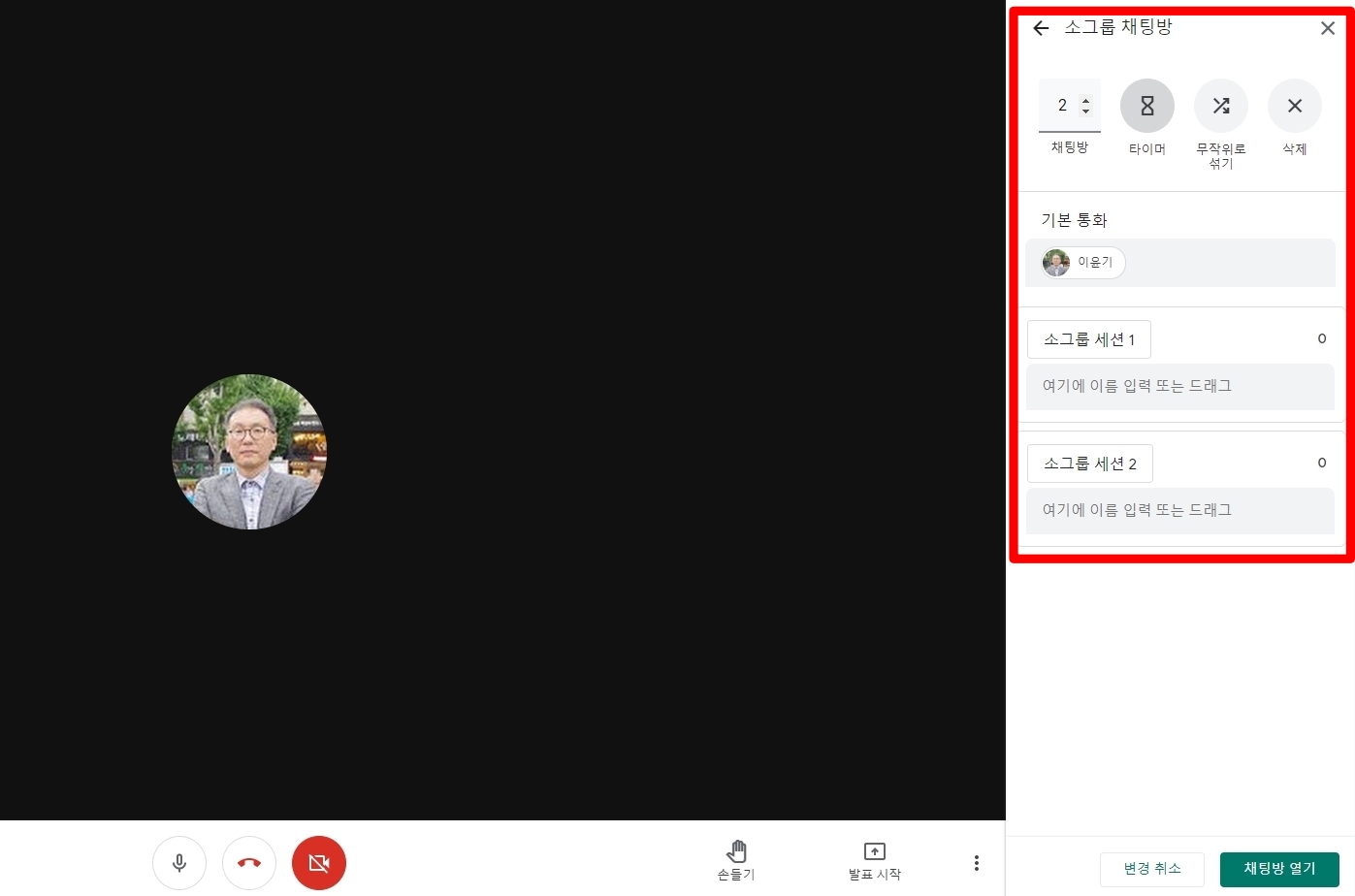 소그룹 채팅방을 선택하면 소그룹 채팅방 설정을 할 수 있습니다. 구글미트 회의 참가자를 다양한 방식으로 소그룹 구성을 할 수 있도록 되어 있습니다.