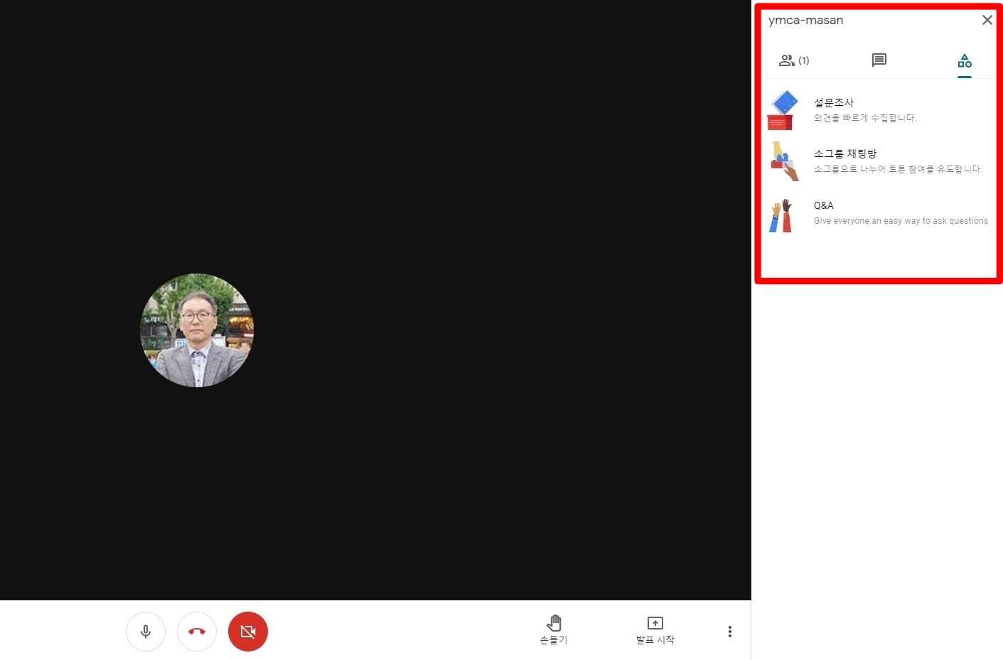 그런데 최근(언제인지 정확히 모름) 구글 미트를 사용해보니 Zoom과 같이 소그룹 토론방을 만드는 기능이 추가 되었습니다. 그 뿐만 아니라 구글답게 자사의 설문지 기능과 질문 기능을 함께 추가하였더군요. Google Workspace 서비스를 시작하면서 달라진 것이 아닌가 하고 짐작합니다. 아무튼 전에 제가 Google Meet를 사용할 때는 없었던 세 가지 기능이 추가된 것으로 보입니다.
