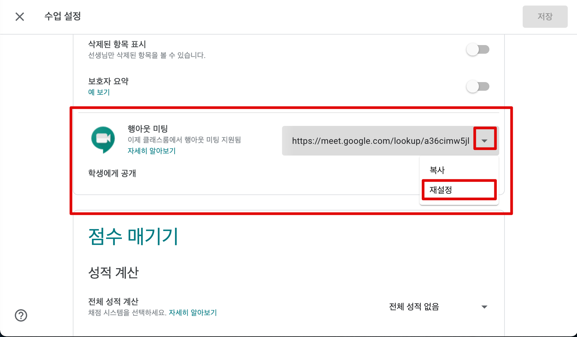 처음엔 이런 기능이 있는 줄 몰라서 전체 교사들이 모두 로그 아웃을 해보기도 하고, 구글 클래스룸을 복사해서 새로 만들기도 하였습니다만, 설정을 자세히 살펴보니 구글 미트 링크 주소를 재설정 할 수 있도록 되어 있었습니다.