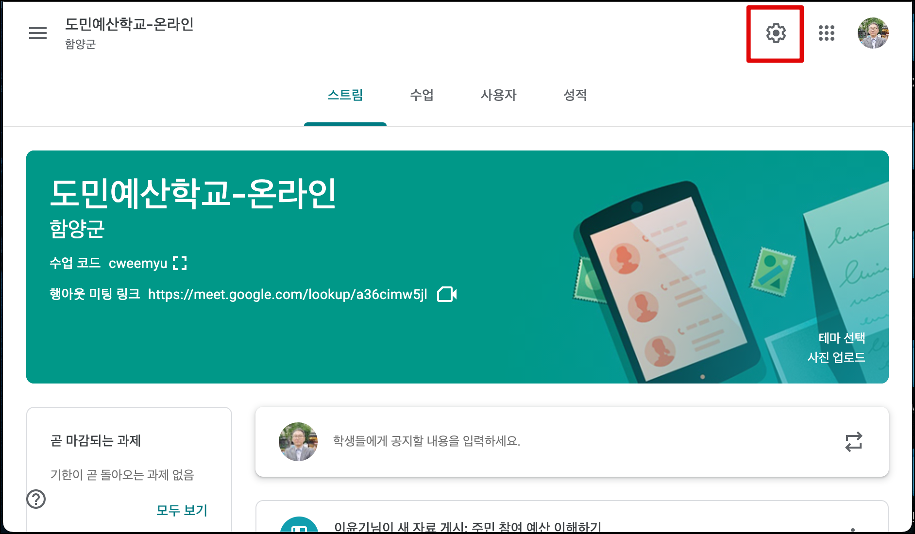 아래 사진처럼 구글 클래스룸에서 <설정>을 누르시고 구글 미트 링크를 재설정할 수 있습니다.