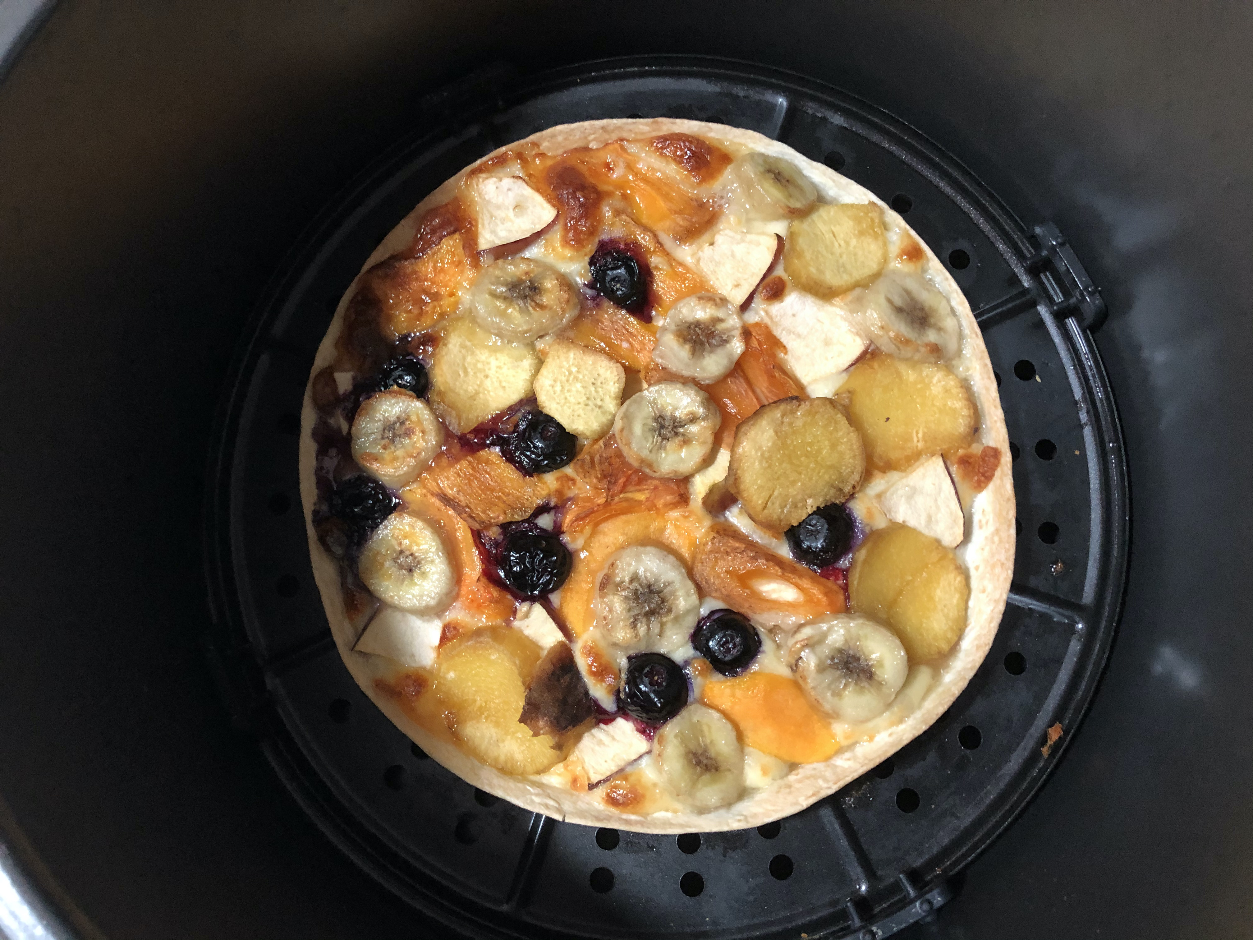 저는 고구마, 바나나, 블루베리, 단감, 사과를 올렸습니다. 에어프라이어에 넣고 높은 온도에서 15분을 맞춰놓고 돌렸는데 10분이 지날 때쯤 치즈가 끈적끈적하게 녹아 있더군요.