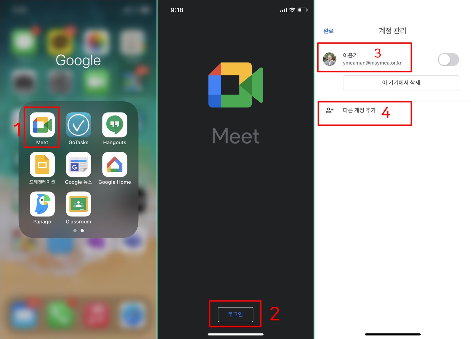 ① 스마트폰에서 1번과 같이 미리 설치한 구글 미트(Meet)를 터치하여 열어줍니다.