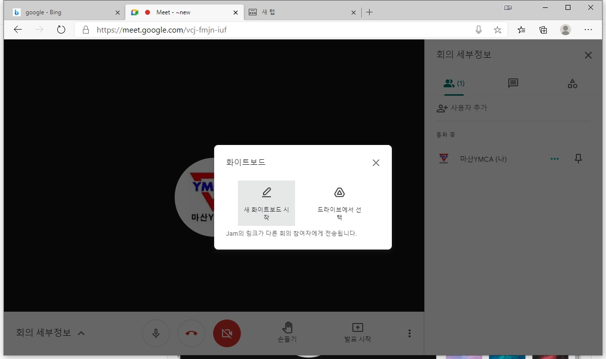 1)화이트 보드를 클릭하면 <새 화이트보드 시작> 메뉴를 선택할 수 있습니다. 새로운 화이트보드를 열어서 칠판처럼 활용할 수 있다. (드라이브에서 선택을 누르면 이미 만들어서 구글 드라이브에 저장 해놓은 화이트보드를 불러 올 수 있다.)