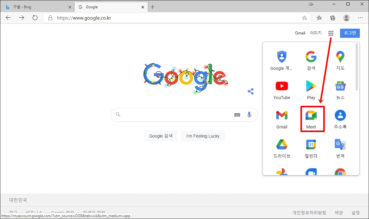 ① 인터넷 창을 열고 주소창에 www.google.co.kr 을 입력하여 구글 첫 화면으로 이동합니다. <로그인> 옆 바둑판 모양을 클릭하면 <Meet>가 나옵니다. Meet를 클릭하시면 됩니다.