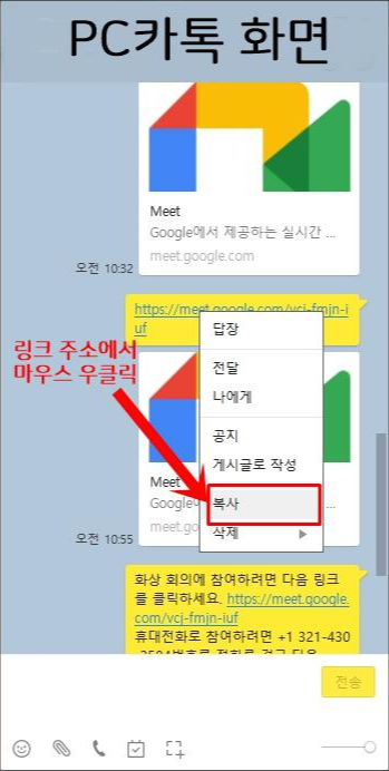 ※ 이런건 설명 안 해도 될 것 같은데...카톡에서 화상회의 링크 복사하는 방법 입니다.